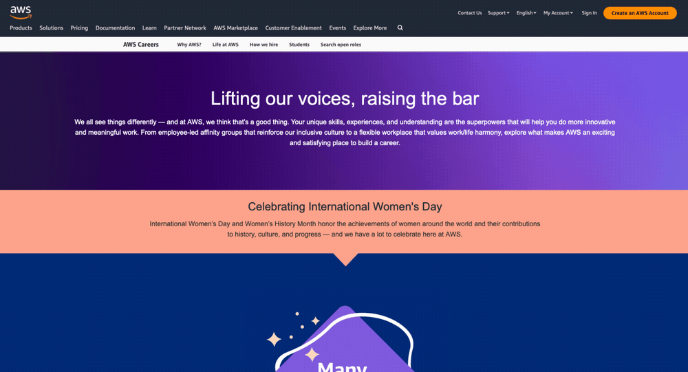 At AWS Employer Brand, we often create global cultural celebration campaigns, aiming to tell authentic stories and cultivating a more inclusive environment. The campaign usually includes a landing page, videos, a blog, multi-channel organic social content, and paid media.